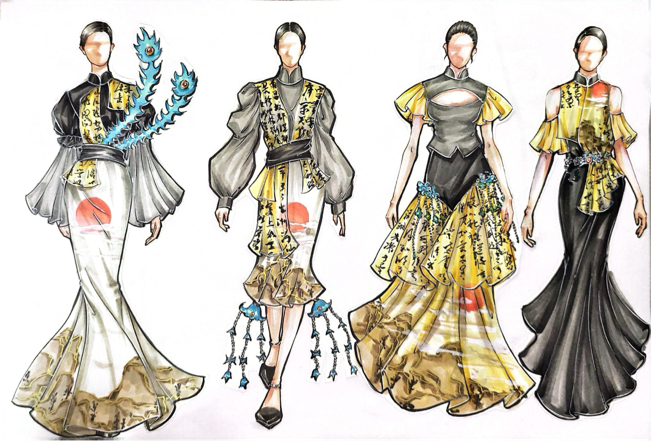 获奖作品亮点纷呈:李小璐同学的作品《煜时欢》(二等奖)巧妙融合传统与现代,以创新的色彩与廓形演绎主题;何羽菲《千里江山》、叶小茜《创世纪》、熊斯遥《孤香·未尽》凭借对色彩的大胆运用与意境营造,共同斩获色彩设计奖;王昱欢《滕翠风华》与李婉祯《傩舞销灾》则通过将非遗技艺、民俗文化融入现代设计,荣获创意设计奖,彰显出深厚的文化内涵与独特创意。