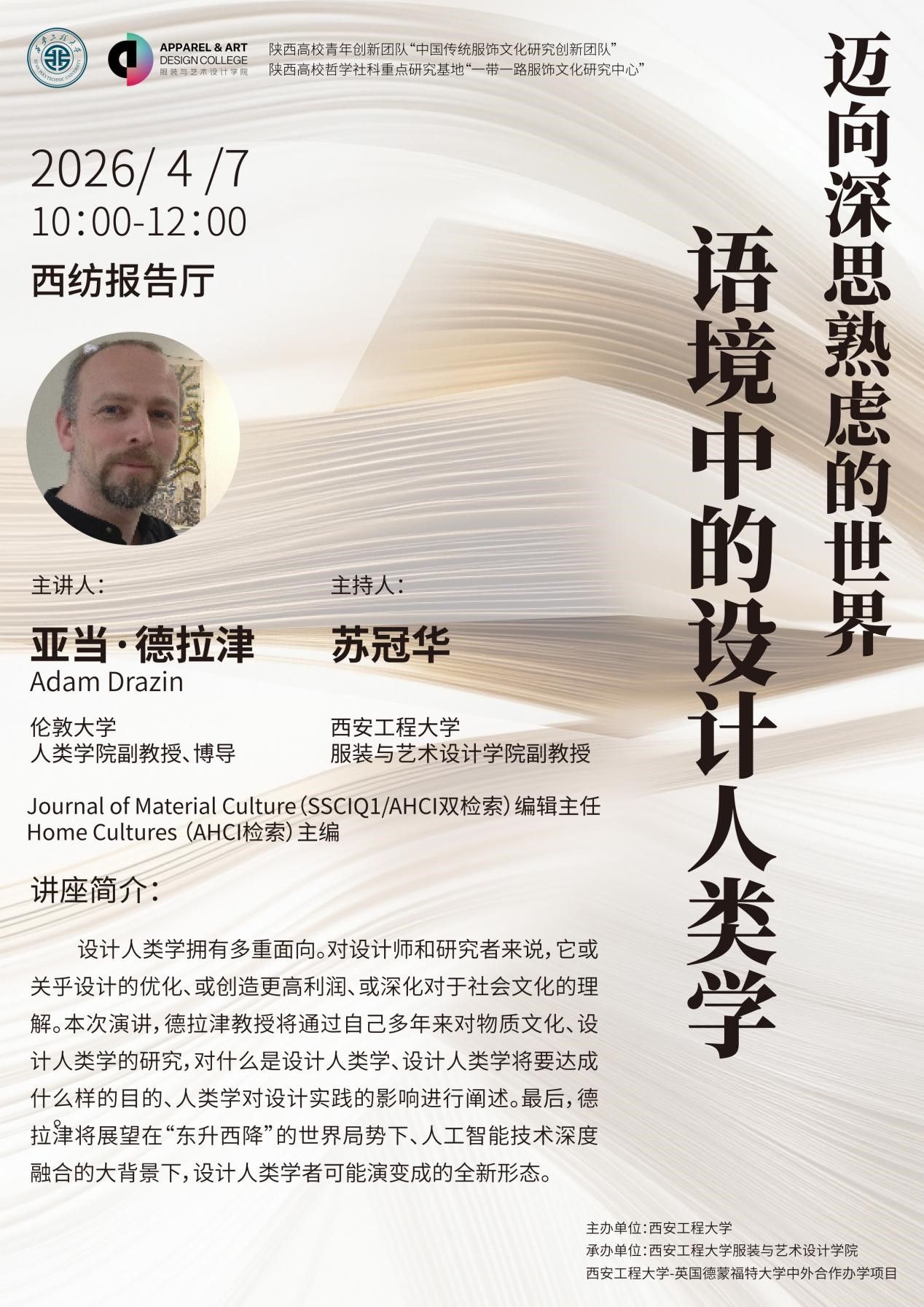 设计人类学作为交叉学科,拥有多重面向。对设计师和研究者来说,它或关乎设计的优化、或创造更高利润、或深化对于社会文化的理解。此次,西安工程大学服装与艺术设计学院特邀德拉津教授,通过自己多年来对物质文化、设计人类学的研究,对什么是设计人类学、设计人类学将要达成什么样的目的、人类学对设计实践的影响进行阐述。